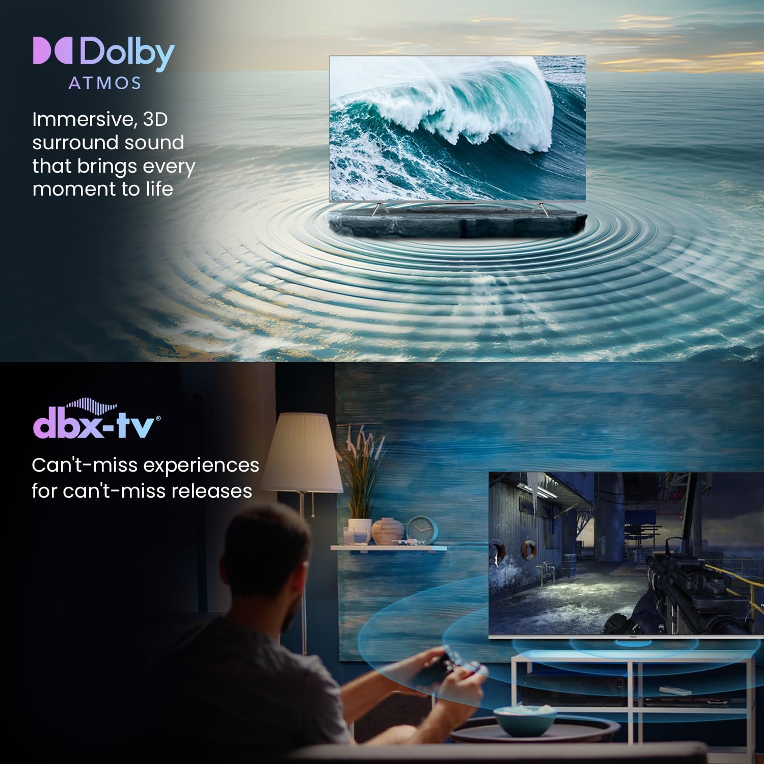 - Sound : 20 Watts Output | 2.0ch Powerful Stereo Speaker with Subwoofer|Dolby Atmos| dbx-tv Sorround Sound| Sound Equalizer| Auto Volume Leveling