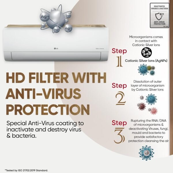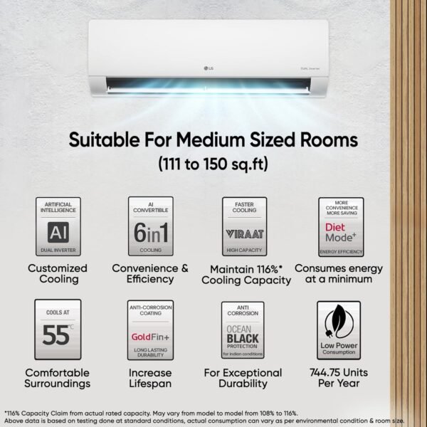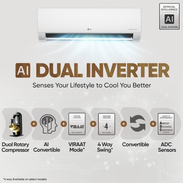 - LG Split AC with Dual inverter compressor: Experience powerful cooling with LG Split AC, featuring an energy-efficient inverter compressor for optimal performance and long-lasting durability.