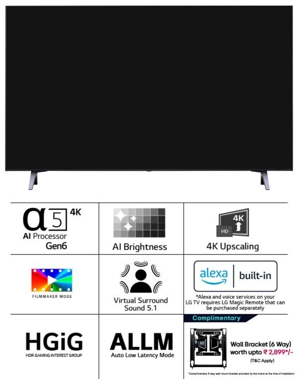 | Product Features | WebOS 23 with User Profiles | Filmmaker Mode, HDR 10 & HLG | Game Optimizer, ALLM, HGIG Mode | Unlimited OTT Apps | AI Brightness Control, 4K Upscaling & AI Sound (Virtual Surround 5.1 up-mix) |