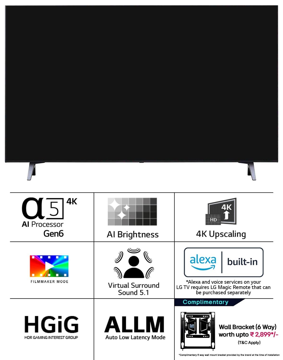| Product Features | WebOS 23 with User Profiles | Filmmaker Mode, HDR 10 & HLG | Game Optimizer, ALLM, HGIG Mode | Unlimited OTT Apps | AI Brightness Control, 4K Upscaling & AI Sound (Virtual Surround 5.1 up-mix) |