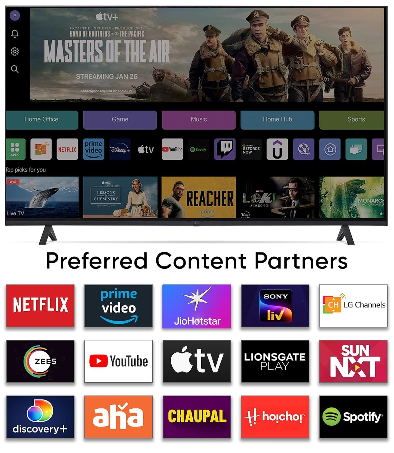- Smart TV Features: WebOS Smart TV | AI ThinQ | Apple Airplay 2 & Homekit | Game Optimizer| Filmmaker Mode | α5 AI Processor 4K Gen6 | HDR 10 |1.5 GB RAM + 8 GB Storage | Unlimited OTT App Support: Netflix, Prime Video, JioHotstar, Apple TV, SonyLIV, Discovery+, Zee5, Voot, MxPlayer, Google Play Movies & TV, YuppTV, Youtube