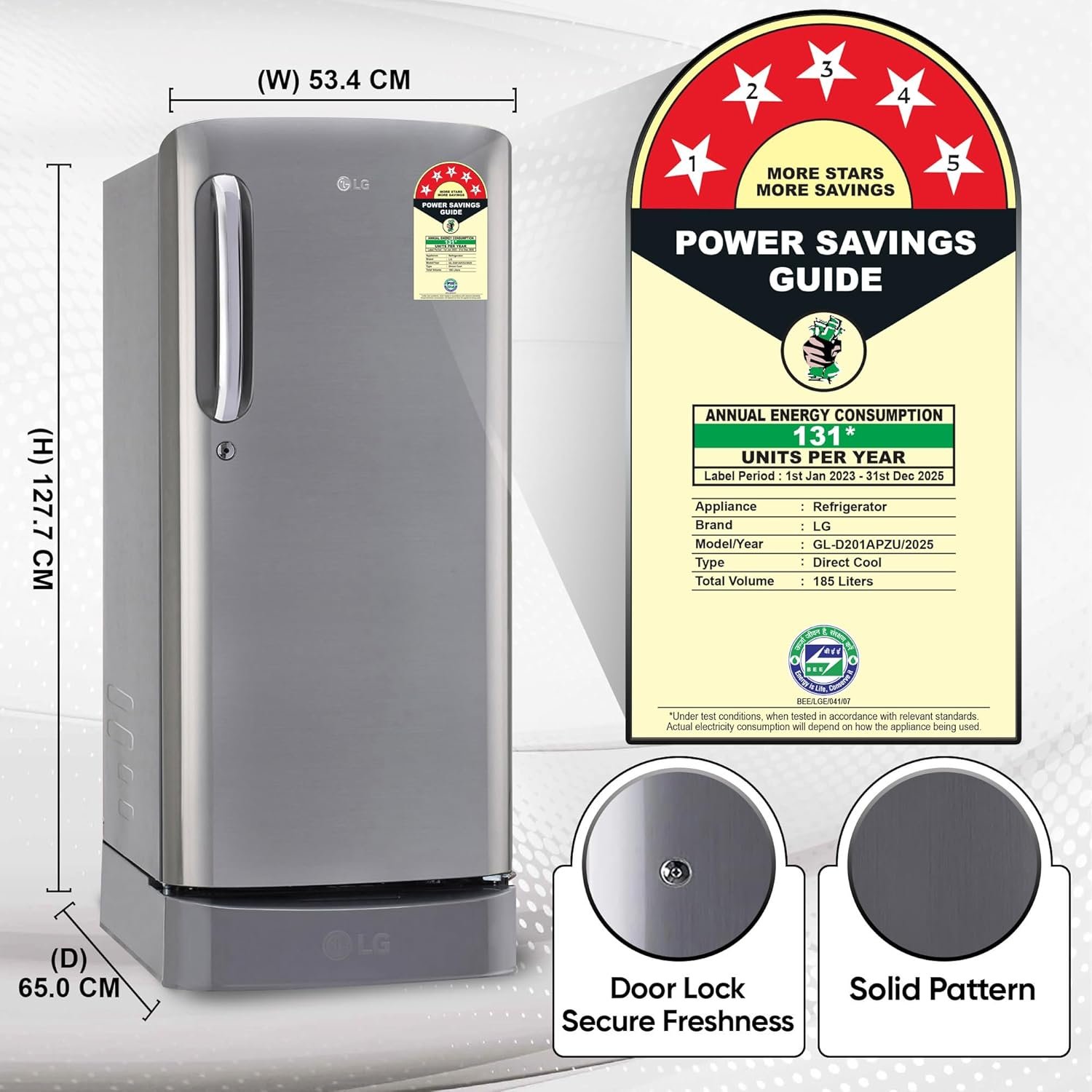 - Energy Rating: 5 Stars Refrigerator – Best in class Efficiency (Higher star ratings lead to lesser electricity consumption lowering bills) | Annual energy consumption – 131 Units per year | BEE Label period ā 01st Jan 2023 to 31st Dec 2025 | The revolutionary Smart Connect technology in LG Direct Cool refrigerator helps you connect your refrigerator to home inverter in case of power cuts. (T&C Apply)