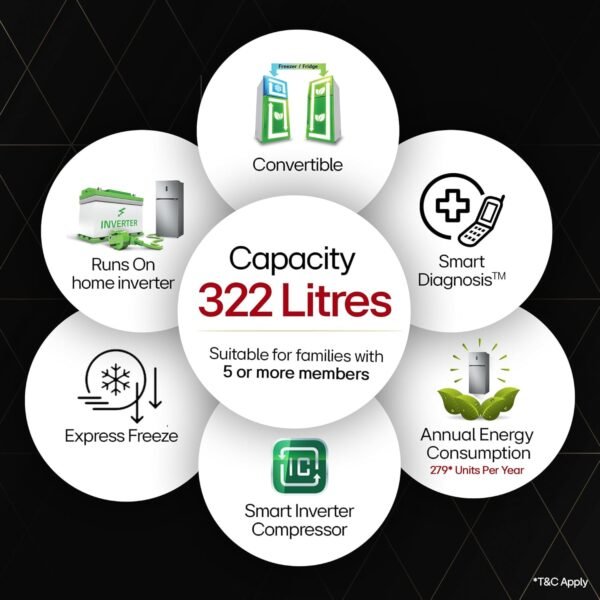 - Capacity 322 L: Suitable for families with 5 or more members I freezer capacity: 81 L, fresh food / Fridge capacity: 241 L