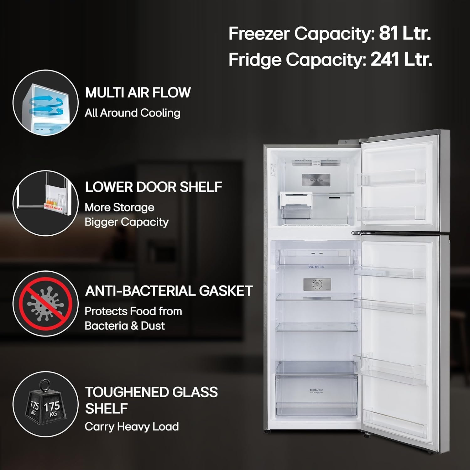 - Storage or Interior description: Fresh food / Fridge capacity: 241 Ltr | Freezer capacity: 81 Ltr | Total no: of compartments: 02, drawers: 01, shelves: 02| Shelf Type: Trimless Tempered Glass | Vegetable box capacity: 28 Ltr | Anti-bacterial gasket | Bottle storage | Tray Ice (No. / Rows): 2/2 | Twist Ice Maker | Pull out tray: efficiently organise and easily access your food items | Tray Egg: 6 Eggs | Door Basket No (Full Size/Half Size) (Nos: RL/RH): 4