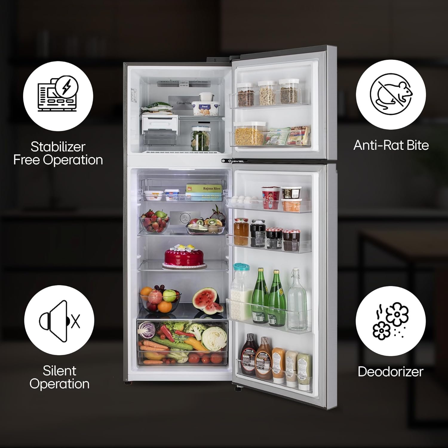 Configuration Freezer-on-Top Additional Features Adjustable Shelves, Convertible, Frost Free, Inverter Compressor, Stabilizer free operation Number of Doors 2 Defrost System Type Automatic Voltage 230 Volts Shelf Type Toughened Glass Form Factor Convertible Ice Maker Dispensed Type Cubed Cooling Method Compressor Inverter Type Has Inverter Lock Type Electronic Number Of Shelves 2 Adjustable Temperature Control Yes Door Orientation Left Compressor Type Reciprocating Has Convertible Freezer Yes Is Product Cordless No Is Customisable? No Is Electric Yes Number Of Racks 6 Number of Sections 2 -