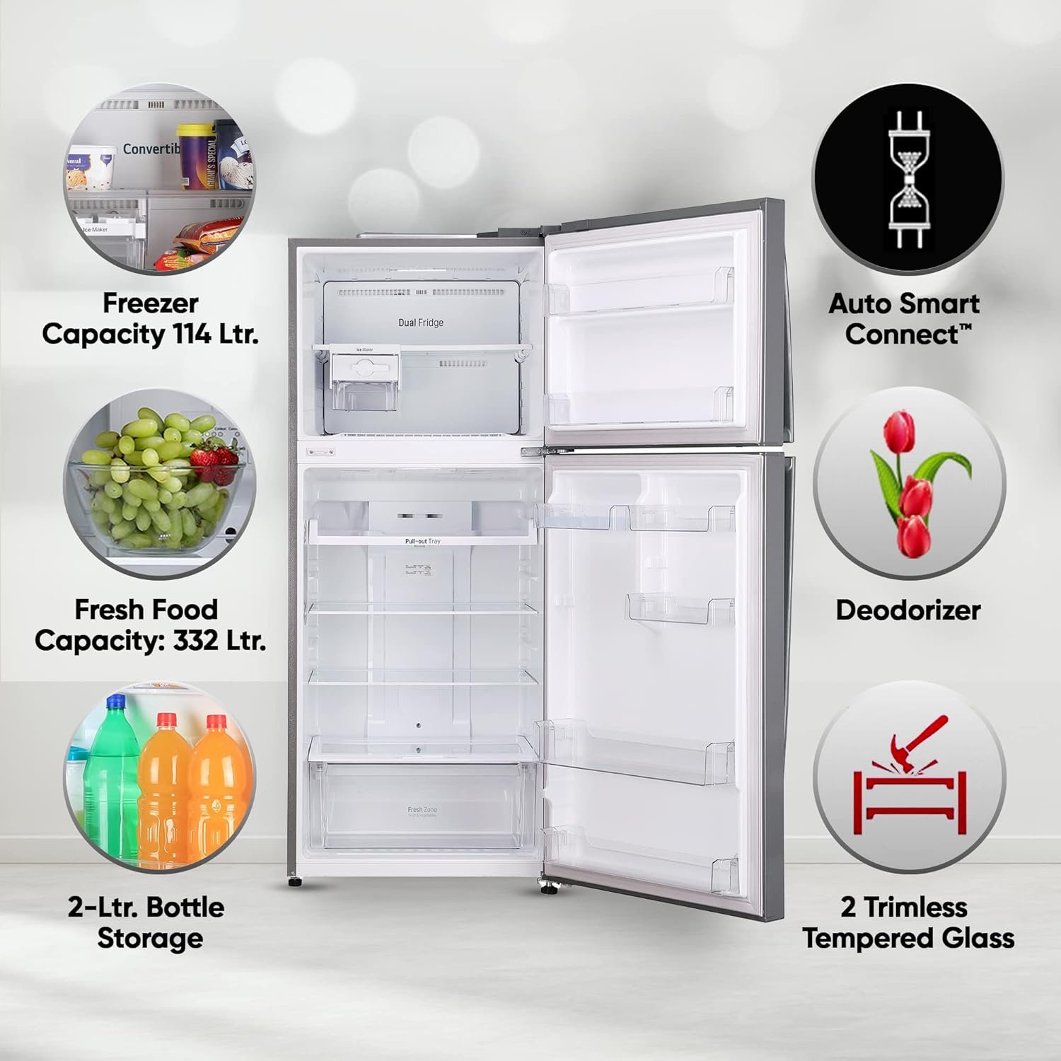 • Capacity 446 L: Suitable for families with 5 or more members I freezer capacity: 114L, fresh food capacity: 332L