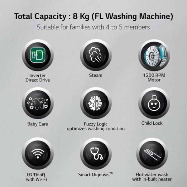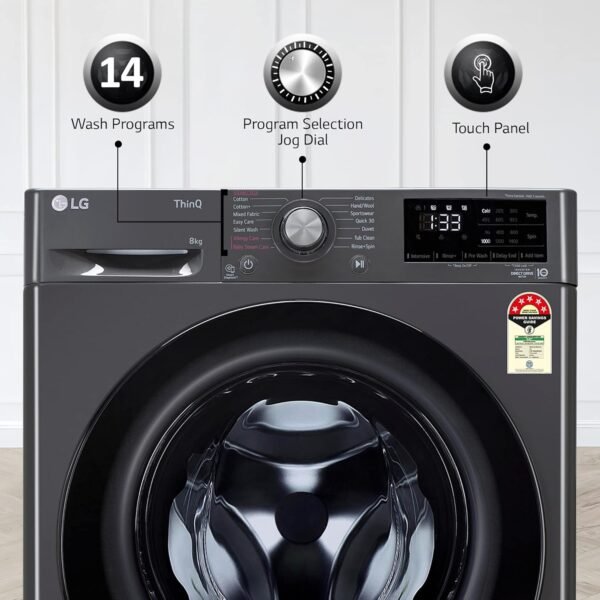 LG 8 Kg 5 Star Inverter Wi-Fi Fully-Automatic Front Loading Washing Machine with Inbuilt heater (FHP1208Z5M, Middle Black, AI DD Technology & Steam for Hygiene)