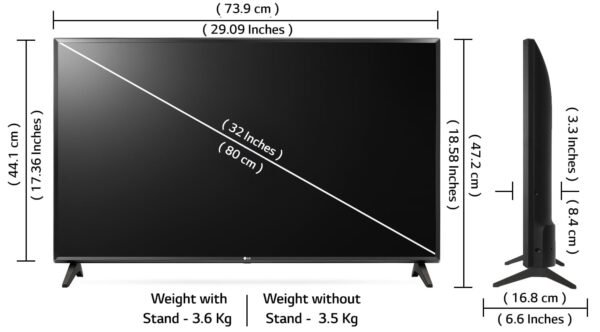 Screen Size Unit of Measure 32 Inches Item Dimensions D x W x H 16.8D x 73.9W x 47.2H Centimeters Item Weight Unit of Measure 3680 Grams Item Weight Without Stand 3.5 Kilograms Display Size Class 80 Centimetres -