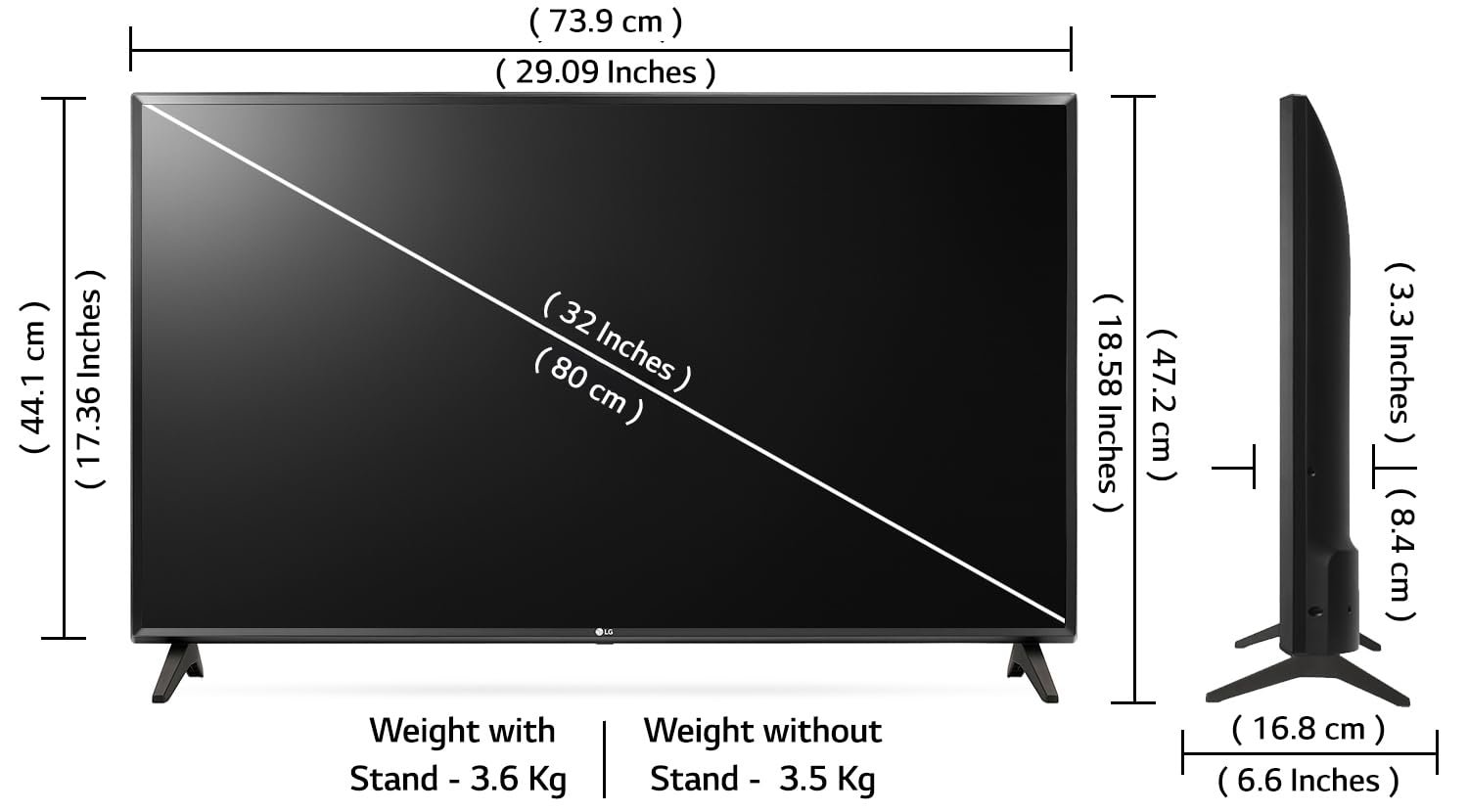 Screen Size Unit of Measure 32 Inches Item Dimensions D x W x H 16.8D x 73.9W x 47.2H Centimeters Item Weight Unit of Measure 3680 Grams Item Weight Without Stand 3.5 Kilograms Display Size Class 80 Centimetres -