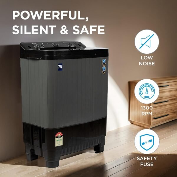 Capacity 7.5 Kilograms Additional Features 1300 RPM, High Efficiency Access Location Top Load Finish Types Plastic Cycle Options Drain, Heavy Duty, Normal Controls Type Knob Operation Mode Semi Automatic Max Rotational Speed 1300 RPM Human Interface Input Dial Installation Type Freestanding -