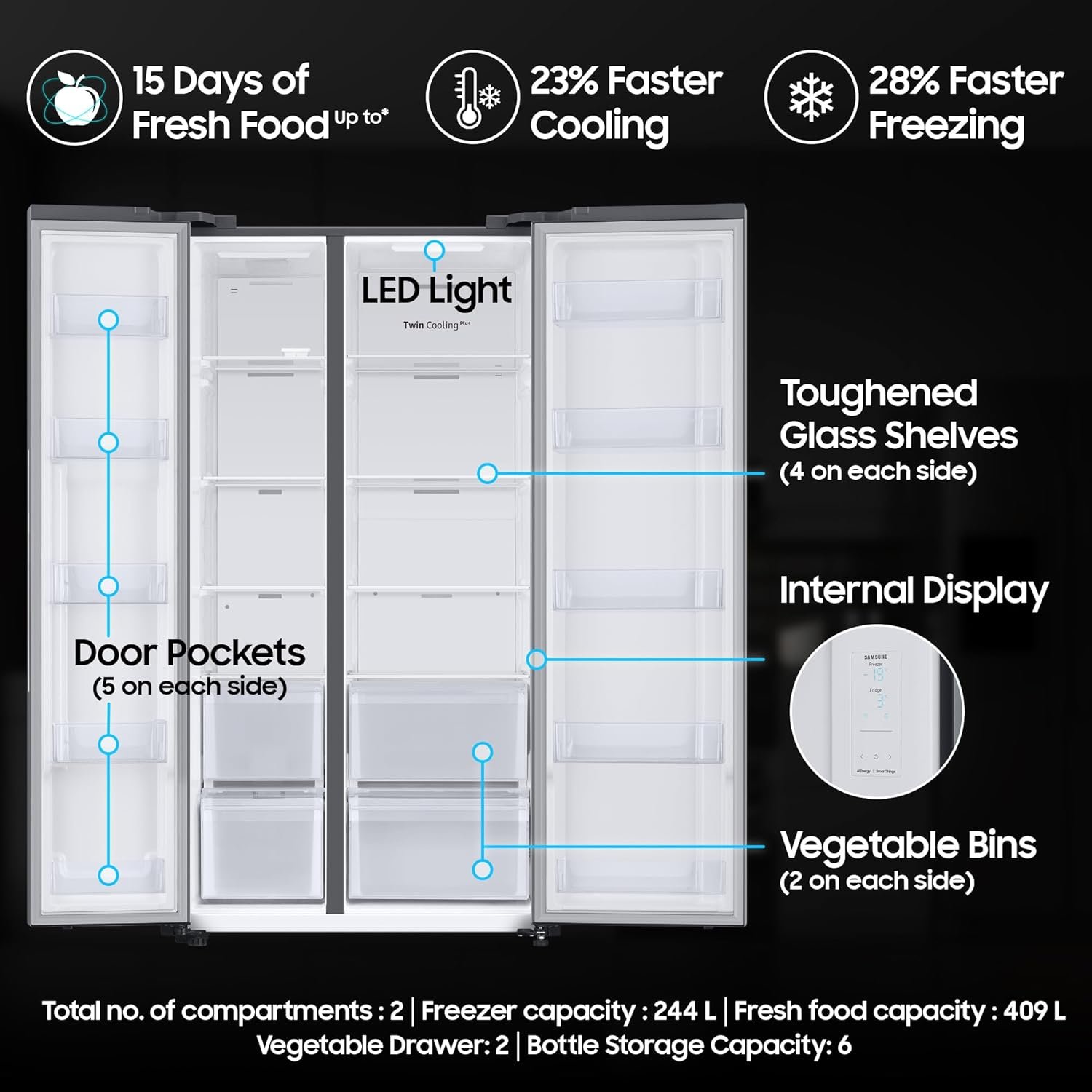 - Interior Description : fresh food capacity : 409 ltr | freezer capacity : 244 ltr | total no. of compartments : 2 | drawers : 2 | shelves : 8 | vegetable drawers : 2 | shelf type : toughened glass shelves | anti bacterial gasket |